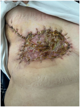 The lesion was categorized as BI-RADS 5, and an axillary lymph node measuring 30 mm with cortical thickening of 8 mm was also detected. Under ultrasound guidance, tru-cut biopsies were performed on both the primary mass and the axillary lymph node.Histopathological examination confirmed invasive ductal carcinoma in the right breast. Immunohistochemical markers showed ER positivity at 30%, PR positivity at 50%, HER2 negativity, and a Ki-67 index of 20%. The axillary node was also confirmed as metastatic. Staging with PET-CT revealed bone metastases involving the sternum and L3 vertebra, with SUVmax values of 4.3 for the primary lesion, 3.8 for the lymph node, and 3.7 for metastatic bone foci.The case was presented at a multidisciplinary tumor board, which recommended systemic therapy with Letrozole, Ribociclib, Denosumab, and Goserelin. Despite initial medical management, the breast lesion progressed. Re-evaluation by the tumor board resulted in a surgical plan targeting the primary lesion. Preoperative physical examination demonstrated extensive skin involvement affecting all quadrants of the right breast, including the nipple-areola complex (Figure 1). MRI confirmed the absence of chest wall invasion. Given the skin infiltration, a wide local excision involving the entire breast skin was planned.A right modified radical mastectomy was performed with the collaboration of general and plastic surgery teams. In the same session, a split-thickness skin graft was used for immediate reconstruction (Figure 2).However, by the first postoperative week, signs of ischemia appeared in the graft (Figure 3), which evolved into full-thickness necrosis in subsequent days (Figure 4). Final pathology showed that 25 of 32 axillary lymph nodes were metastatic, and the tumor extended to the pectoral muscle. Due to the failure of the skin graft, a second-stage reconstruction was performed using a latissimus dorsi myocutaneous flap, known for its vascular reliability (Figure 5).
