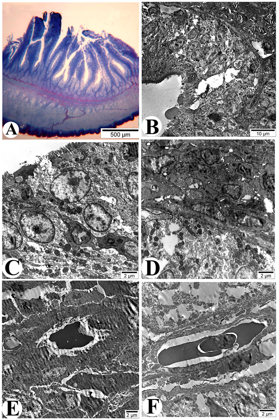 Развитие нанотехнологий в XXI веке стало одной из ключевых сфер современного научного прогресса. Однако их широкое применение сопровождается серьёзной экологической проблемой: растущее количество наночастиц попадает в окружающую среду, где они способны накапливаться и взаимодействовать с живыми организмами. Особенно уязвимыми оказываются водоплавающие птицы, тесно связанные с водными экосистемами и подвергающиеся влиянию загрязнителей, поступающих в водоёмы. В этой связи целью данного исследования было выявить особенности накопления наночастиц серебра в органах домашних гусей и охарактеризовать вызванные ими изменения на ультраструктурном уровне в печени и кишечнике. В эксперименте на птицах применяли синтезированные наночастицы серебра в дозировке 100 мкг/мл. Из зафиксированных образцов кишечника и печени готовили блоки, окрашенные срезы которых изучались с помощью световой и электронной микроскопии. В условиях in vivo частицы серебра, локализованные в различных слоях тонкого кишечника и печени, имели размеры от 10 до 13 нм. Установлено, что после введения наночастиц у гусей развивались патологические изменения во всех слоях кишечника и печени на ультраструктурном уровне.