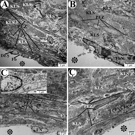 Dişli bağın başlanğıc hissəsində (şəkil 5A) sərt qişada olduğu kimi (bax şəkil l və səkil 2) pəncərəli elastiki zarın (PZF) təşkilində iştirak edən elastiki liflərin aralarında kollagen lifi səfhələri (KLS) yerləşirlər. Təsvir olunan elektronoqrammada digər diqqəti cəlb edən onun diaqonalı boyu yerləşən elastiki lifin mərkəzi hissəsinin iki şaxəyə bölünməsidir. Dişli bağların gedişi boyu isə elastiki liflərin köndələn kəsikləri aralarında fibrisitlərin mərkəzi və periferik hissələri ilə əhatə olunmuş kollagen lifi dəstələri (KLD) yerləşirlər (şəkil 4B -4C və şəkil 5B). Şəkil 5C-də maraqlısı odur ki, dişli bağın təşkilində iştirak edən şüalı quruluşa malik olan fibrosit sitoplazmasından başlayan çıxıntıların kollagen lifi dəstələrini əhatə etməklə yanaşı elastiki liflərlə də sıx əlaqədə olurlar. İlk baxışda elastiki liflərin kollagen lifləri arasında yerləşdiyi təsəvvürü yaranır.