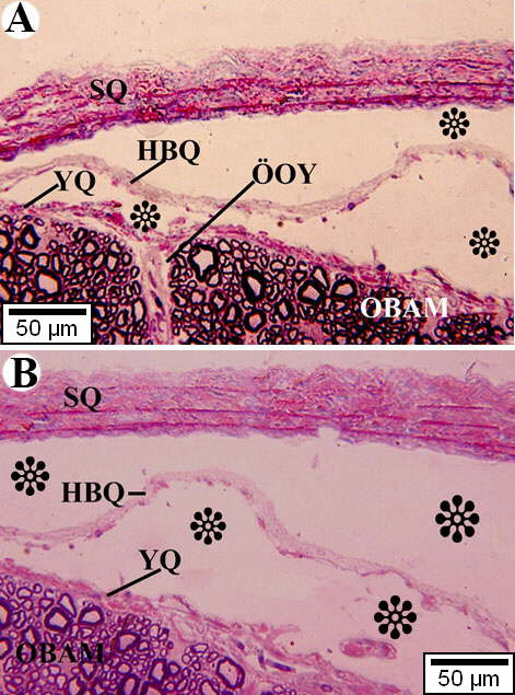 Ev ördəklərinin onurğa beyninin qişaları və ağ maddələrinin histotopoqrafiyası şəkil 1A və 1B-də nümayiş etdirilmişdir. Göründüyü kimi sərt qişa (SQ) ilə yumşaq qişa (YQ) arasında zolaq şəklində yerləşən hörümçəktorunabənzər qişanın ətrafinda (HBQ) rənglənməmiş hissələrin (ulduzlarla işarə olunublar) olması, ilk baxışdan onların subdural (yuxarıda) və subaraxnoidal (aşağıda) boşluqlara aid olduqları kimi qəbul oluna bilər. Şəkil 1A-da nəzər diqqəti cəlb edən yumşaq qişa elementlərinin onlarla birlikdə damarların onurğa beyninin ön orta yarığına (ÖOY) daxil olmasıdır. Onurğa beynin ağ maddəsinin (OBAM) təşkilində müxtəlif diametrli mielinli sinir liflərinin təşkil olunduğu aydın görünür.