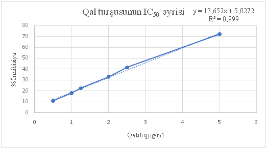 Burada, y göstəricisi IC50 göstəricisini müəyyən etmək üçün 50% ilə əvəz edilir, x isə kalibrə əyrisinə görə IC50 kəmiyyətidir, μg/ml və ppm ilə ifadə olunur. Kalibrə əyrisində korrelyasiya əmsalı dəyərinin 0.999 olması kəmiyyətlər arasında düz mütənasib asılılığı göstərir. Analiz edilən nümunənin qatılığı artdıqca antioksidantlıq da artmağa doğru gedir[9].